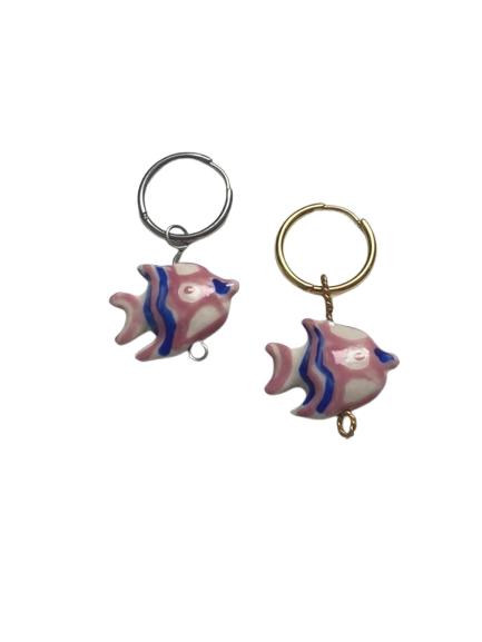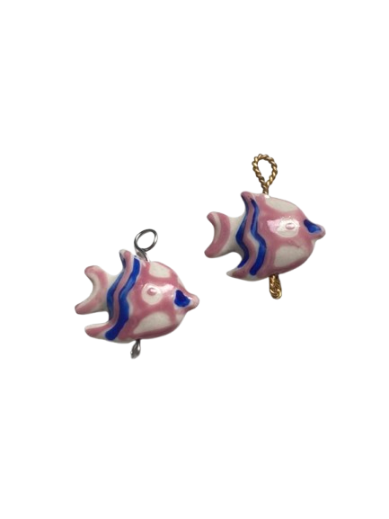 Breng kleur en karakter in je sieradencollectie met deze roze vis bedel van keramiek. Met de hand vervaardigd en glanzend afgewerkt in een zachte, speelse roze tint. Elke bedel is uniek en geeft jouw oorbel of ketting een vrolijke en persoonlijke uitstraling.